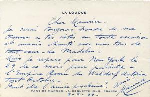 CHEVALIER MauriceDans les années 1950, Maurice Chevalier s’installe avec son frère Paul à “La Louque” à Marnes-la-Coquette. Odette Bontemps, étant jeune veuve, vécu avec son fils auprès de Maurice Chevalier dans sa propriété. Lettre autographe signée « Maurice », adressée à Odette Bontemps. 29 septembre 1955 ; 1 page in-4°, sur papier à en-tête du Waldorf-Astoria à New York.« Longuette chérie. Avons débuté hier soir. Majorité de la presse excellente. Minorité moins. Tout dépendra donc de l’affluence du public. Je te tiendrai au courant. J’espère que tout notre petit monde va bien. Je vous embrasse bien tendrement. Maurice. »