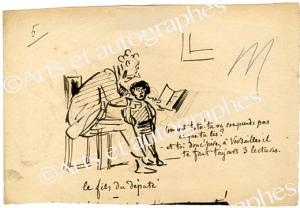 CHAM (Amédée de Noé, dit)Dessin original. [Vers 1869] ; 12,2 x 18 cm. Dessin paru dans le Charivari. Amusant dessin autographe caricatural légendé « Le fils du député ». « — Comment toto ! tu ne comprends pas ce que tu lis ?— Et toi donc ! père, à Versailles il te faut toujours 3 lectures.»
