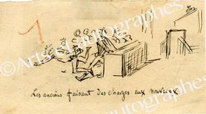 CHAM (Amédée de Noé, dit)Dessin original. [Vers 1874] ; 8,5 x 15,5 cm. Dessin paru dans le Charivari. Amusant dessin autographe caricatural sur l’Assemblée nationale sur les nouveaux députés : « Les anciens faisant des charges aux nouveaux »