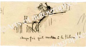 CHAM (Amédée de Noé, dit)Dessin original. [Seconde moitié du XIXe siècle] ; 8 x 15 cm. Dessin pour le Charivari. Amusant dessin autographe caricaturant l’Assemblée nationale : « Chaque fois qu’il montera à la tribune ! »