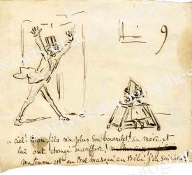 CHAM (Amédée de Noé, dit)Dessin original. [Seconde moitié du XIXe siècle] ; 13 x 15,5 cm. Dessin pour le Charivari. Amusant dessin autographe caricatural légendé : « Ciel ! Mon fils n’a plus son bourrelet ! Sa mère et lui ont changé de coiffure ! Ma femme est au bal masqué en bébé, j’en suis sûr ! »