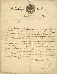 CHAMPOLLION-FIGEAC Jacques JosephLettre autographe signée [adressée à Jacques-Henri Rudemare]. Paris, 26 février 1830 ; 1 page in-4° sur papier à en-tête de la Bibliothèque du Roi, avec vignette, fentes aux plis. « J'ai bien reçu avec la lettre que vous m'avez fait l'honneur de m'écrire le 22 de ce mois, la copie écrite de votre main du narré de la procédure qui eut lieu à, l'occasion de la demande en nullité de Napoléon Bonaparte et de Joséphine Tascher de la Pagerie ». Jacques-Henri RUDEMARE [1758-1841], curé de Notre-Dame des Blancs-Manteaux, chanoine de Paris. occupait au tribunal ecclésiastique de l'archevêché de Paris le poste de promoteur, c'est-à-dire de procureur. Il fut au coeur de la procédure d'annulation du mariage de Napoléon Ier avec Joséphine de Beauharnais.