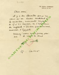 CARCO FrancisLettre autographe signée, adressée à Pierre Lagarde. [17 juin 1936] ; 1 page in-4° avec en-tête à son adresse « 79 quai d’Orsay ». « Il y a des éternités que je ne vous ai vu. Aussi cocktail à la maison, mercredi 24 juin, de 17 à 21 heures, en l’honneur des enfants d’Eliane qui arrivent, mariés, d’Égypte. » Au dessus de la signature figure un dessin aux crayons de couleurs représentant un coeur percé d’une flèche.