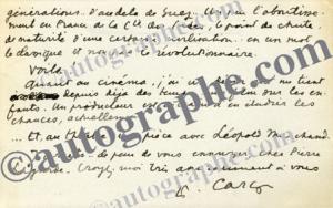 CARCO Francis (François Carcopino-Tusoli, dit)Lettre autographe signée, adressée à Pierre Lagarde. Paris, 23 décembre 1938 ; 2 pages in-12 oblongues sur carte à en-tête à son adresse « 24 rue Barbet de Jouy ». À la veille de l’année 1939, Carco évoque ses projets « assez confus ». Il publiera « Verlaine, poète maudit. Ensuite une édition complète de La Bohème de mon coeur puis en mai ou juin : Bohême d’artiste (chez Albin Michel). Je prépare un Baudelaire ou l’exotique à Paris... c’est-à-dire le poète produit par plusieurs générations d’au delà de Suez... Un peu l’aboutissement en France de la Cie des Indes, le point de chute, de maturité d’une certaine civilisation... en un mot le classique et non pas le révolutionnaire. » Il évoque ensuite ses projets pour le cinéma et le théâtre.
