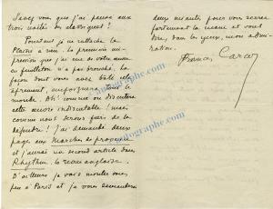 CARCO FrancisLettre autographe signée « F » [adressée à Eliane Négrin]. Vendredi ; 3 pages ½ in-8°, sur un bifeuillet. Superbe lettre d’amour adressée à son trésor pour toujours. « Il y a entre nous une telle union, si vraie et désormais si fatale que cela donne à notre affection une sécurité nouvelle, sans rien enlever à sa ferveur et sans la rendre moins subtile. Ce qui me plaît surtout dans ce que vous me dites, c'est que j'y sens le besoin que vous avez de moi : ainsi, cela rassure un peu celui que j'ai de vous. […] J'ai lu cette nuit quelques pages de Chamfort et les pensées de cet être si délicat, si lucide et si corrosif ont eu pour moi le mordant d'un acide et le charme d'un parfum. Tout ce que la jouissance la plus furieuse peut ruiner dans un être d’espérance, de lassitude et de nostalgie, il l’a, aussi bien qu'il conserve toute la sensibilité mécontente d'une âme fière. Si l'on s'y habituait à fréquenter de pareils esprits, on deviendrait aussi misanthrope qu'eux, et le moindre dîner entre gens prétendus agréables ne paraîtrait plus qu'une insupportable réunion de butors qui n'ont pas plus senti que joui ou réfléchi. Mais non, il faut s'amuser, il faut au moins les forcer à nous divertir. Les gens doivent être nos comédiens, et nous devons avoir une troupe comme le Roi. Du moins si ce dégoût du commun des êtres a quelque prix, c’est qu'il nous fait mieux sentir la valeur et la rareté de nos affections. Et nous sommes plus sûrs de la valeur des êtres que nous aimons quand nous voyons combien nous sommes difficiles et tout ce que nous avons éliminé. Et je suis sûr, mon amie chérie, si haut que j'élève votre valeur, je ne l'augmenterais jamais au-delà de ce que vous pouvez être et de ce que vous êtes ». Après lui avoir demander de suivre son conseil, « tuer votre mal à force de repos », il lui propose de fixer elle-même leur rendez-vous pour le dimanche suivant : « Fixez le lieu et l’heure je vous prie selon votre désir et ne balancez pas à me demander de venir chez vous. Pour peu que cela vous soit plus commode ». C’est en 1932 lors d’une tournée de conférences en Égypte, Carco avait rencontré Éliane Négrin, épouse du prince Nissim Aghion. Carco divorça de sa première épouse en novembre 1935 et se remaria avec Eliane ─ qui avait quitté enfants et mari pour le retrouver ─ le 11 février 1936.