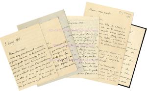 CARCO Francis6 lettres autographes signées, adressées à Charles-Henry Hirsch :— Sans date ; 2 pages in-8°. « Je vous remercie bien vivement de votre aimable recommandation auprès du Président de la Société des Gens de Lettres et du souci que vous avez bien voulu prendre d’envoyer à Henri Duvernois ma lettre apostillée par vous. Je vais envoyer à M. Lefevre mon petit bouquin. »— Nice, 25 janvier 1913 ; 4 pages in-4°. « Je vous écris, en plein carnaval et si je m’amuse et me repais d’impressions grotesques et singulières (les détails de la foule sont curieux), je n’oublie pas Jésus-la-Caille dont je viens d’achever un chapitre. Avant mars, le manuscrit sera prêt. […] Je crois que ce livre sera bon. En tout cas, je m’y donne entièrement, quitte à ne pas obtenir le prix Goncourt. […] Bientôt vous recevrez mes chansons aigres-douces. Je donnerai en outre à Sausot le volume de critiques sur la jeune poésie, et à Figuière en collaboration avec Derème une Anthologie des Poètes Fantaisistes. Mon année est bien remplie. »— Nice, 25 mars 1913 ; 3 pages in-8°. « Je vous remercie bien vivement de la longue citation que vous avez faite dans votre chronique du Mercure de mon article sur Les Femmes et la Poésie. N'ayant pas eu de vos nouvelles depuis longtemps, je craignais de vous avoir déçu avec mon petit livre de poèmes et j’en était fort malheureux car vous savez mon admiration pour votre œuvre et sous quelle haute estime je tiens votre jugement. »— Nice, 3 avril 1913 ; 4 pages in-8°. « Vous avez grandement raison et je vous remercie de la franchise avec laquelle vous m’avez donné votre avis, mais les Chansons ont été tirées à peu d’exemplaires et je n’attends pas qu’on me juge sur elles. […] Je travaille encore à Jésus-La-Caille. J’ai une joie profonde à le faire. Ah, quelle sérénité peut donner un premier long effort ! Je sens que j’écrirai maintenant tout ce que je dois écrire. »— « Dax, vendredi » [3 mars 1917] ; 2 pages in-8°. « J’ai de fâcheuses erreurs de mémoire. Le traitement que j’ai suivi ici ne m’a pas fait grand chose et j’ai peur de tirer la jambe en courant. Rien n’est plus ridicule. Ici, cher ami, j’ai travaillé. Mon roman avance. Je vous en parlerai et je crois que vous me féliciterez d’avoir abandonné mes jeunes gens en casquette pour d’autres qui se disent artistes. »— Paris, 28 mai 1918 ; 2 pages 1/2 in-8°. « Voulez-vous, cependant, si vous en trouvez l’occasion, m’aider à conquérir au Journal la sympathie de mes aînés et celle de M. Letellier ? J’ai en effet l’intention d’envoyer autre chose à Lucien Descaves qui a fait passer mon conte de dimanche. Je vous assure que je ne serai pas encombrant mais s’il m’était possible de donner une nouvelle, à peu près, par mois, j’en serais enchanté. »