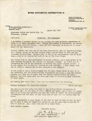 BYRD RichardLettre signée, adressée à la Mishawaka Rubber and Woolen Manufacturing Company. Boston, 25 août 1933 ; 1 page in-4°. En-tête imprimé « Byrd Antarctic Expedition II ».« Making a personal appeal to you to help the Byrd Antarctic Expedition II which is to leave September 15. During this period of depression, on account of the many destitute people, I have not felt warranted in going out to raise money for our Expedition. We have reached the very end of our rope financially, and our Expedition hangs by a thread, unless we can get certain items donated which we have not yet succeeded in procuring. We have gone so far in our requirements that it would seem a pity to be stopped for lack of one or two vital items [...]. We are going to use a Curtiss-Condor for the main flying which we will do in the Antarctica and the Curtiss-Wright Corporation are going a long way towards helping us. They are in hopes that the various manufacturers who supply material for his plane will see their way clear to be able to make donations of their parts [...]. On looking over their list I find that you manufacture the following: Monopul Fasteners for inspection pockets $63.00 per ship...»Il lance un appel à soutenir son expédition antarctique Byrd II. Il évoque lutilisation dun Curtiss - Condor « pour le principal vol que nous ferons dans lAntarctique et la Curtiss - Wright Corporation va nous aider ».