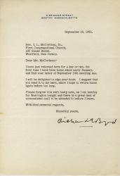 BYRD Richard EvelynLettre signée, adressée à un admirateur, McCorison. Boston, le 19 septembre 1950 ; 1 page in-4°. « I will be delighted to sign your book. I suggest that you send it to me here, since I hope to return home again before too long. Please forgive this very hasty note, as I am leaving for Washington tonight and there is a great deal of accumulated mail to be attended to before I leave. »