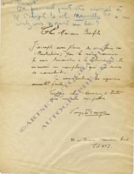 BRUYER Georges LéonLettre autographe signée, adressée au peintre Bonfils. Paris, sans date ; 1 page in-4°. « J’accepte avec plaisir de vous faire ces illustrations ; par le même courrier, je vais demander à la librairie qu’elle m’envoie un exemplaire qui me servira de manuscrit. Je vous porterai les esquisses aussitôt faites. »