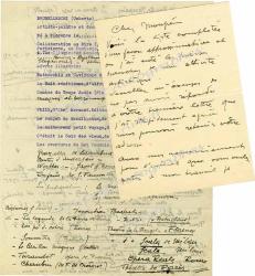 BRUNELLESCHI UmbertoLettre autographe signée, adressée à René Druart, de la Société des Amis des Arts. 1 page 1/2 in-12, enveloppe timbrée jointe.« Voici la liste complète d’une façon approximative et où j’ai noté les diverses branches de mon activité artistique. »On joint un manuscrit autographe de 2 pages in-4° très partiellement dactylographié et qui concerne des renseignements autobiographiques et la liste de ses illustrations et œuvres principales.