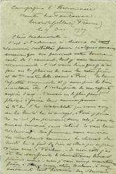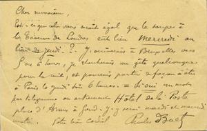 BUET CharlesCarte autographe signée, adressée à M. G. Eckhoud. 31 mars 1890 ; 1 page in-12, adresse timbrée au dos. « Est-ce que cela vous serait égal que le souper à la Taverne de Londres eût lieu mercredi au lieu de jeudi ? J'arriverais à Bruxelles vers 5 ou 6 heures, je chercherais un gîte quelconque pour la nuit, et pourrais partir de façon à être à Paris le jeudi soir 6 heures. »