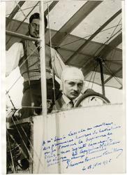 BUNAU-VARILLAPhotographie dédicacée à Émile Lassalle. « En souvenir des premières heures de laviation ou je donnais le baptême de lair à mon regretté camarade de classe le capitaine Mahieu tombé au champ dhonneur. Étienne Bunau Varilla. Le 15 nov. 1936 ». Photographie en retirage ancien.On joint une carte postale ancienne dédicacée en 1957 : « Souvenir de ce qui était alors pompeusement appelé la conquête de lair ! »