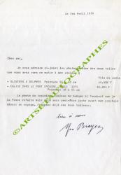 BRAYER YvesLettre dactylographiée signée. 1er avril 1978 ; 1 page in-4°. Il s’agit d’une proposition de deux de ses toiles : « Je vous adresse ci-joint les photographies des deux toiles que vous avez vues ce matin à mon atelier : — Oliviers à Delphes, peinture 54 X 65 cm — prix de vente 26 500 F, — Église dans port d’Égine, Grèce, 1975 — 15 900 F. »