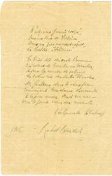 BRASILLACH RobertPièce autographe signée intitulée « Stances de Pierrot à Colombine ». 1925 ; 1 page in-8°. « Pour avoir vue au clair de luneSe pencher sur ses beaux espoirsL’enfant à chevelure bruneJe vous ai désirée un soir.L’ombre était pleine de murmuresNos regards ne pouvaient s’y voir. »Au dos figure un autre poème autographe signé (encre pâle) :« N’avez vous jamais évoquéSous une lune de VerlaineDans un parc discret et coquetLa Comédie Italienne ?La brise dit des mots d’amourQui volent de branches en branches, Et sous les mantes de veloursLes satins ont des clartés blanches. »