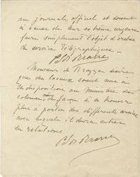 BRASSEUR AlbertLettre autographe signée, adressée au rédacteur [du Gaulois ?]. Sans date ; 1 page in-12.« Je n’ai pas l’honneur de connaître votre nom, c’est donc au “Bourgeois de Paris” que j’envoie mes plus sincères remerciements pour l’article si plein de coeur que vous consacriez hier à mon père regretté ! Ma chère mère et mon frère Jules se joignent à moi pour vous remercier. »