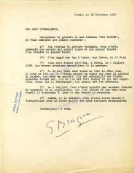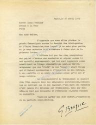 BRAQUE GeorgesLettre dactylographiée signée adressée à Fernand Crommelynck. Paris, 15 décembre 1956 ; 1 page in 4°. « Concernant la gravure de mon tableau “LES FLEURS”, je vous confirme les points suivants : 1°) Vos travaux de gravures terminés, vous m’avez présenté des essais sur papier blanc et sur papier teinté. J’ai éliminé le papier blanc. [...] 3°)Vous avez déposé chez moi, à Paris, le 2 Juillet 1956, les trente premier exemplaires de la gravure. 4°) M.et Mme LEAL sont venu me voir le même jour. Je leurs ai dit que je n’avais marqué un choix que pour la couleur du papier, non pour sa qualité. Ils ont estampillé ces trente épreuves devant moi. Ils me les ont fait signer et les ont emportées. Comme ils le désiraient, les essais ont été détruits. [...] 6°) Enfin le 14 juillet, vous m’avez rendu visite à Varengeville pour me faire signer les neuf derniers exemplaires. Cordialement à vous, G. Braque.»