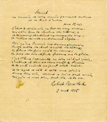 BRASILLACH RobertPièce autographe signée intitulée « Sonnet. En souvenir de note dernière promenade nocturne et de tant d’autres ». 2 août 1925 , 1 page in-8°. « Pour Marie,C’était le dernier soir au bord des eaux sereinesNous étions dans la chevelure des roseaux,Et les roseaux chantaient aux caresses des eaux...La musique de nuits nonchalamment s’égrène...Voici qu’un souvenir aux douceurs souverainesSemble naître du chant recueilli des oiseauxLa fileuse des jours arrête ses ciseaux ;La paix des soirs défunts frissonne sur le plaine.C’est l’heure impérissable au dieu méchant ravie,L’instant où dans nos coeurs renaît le souvenirDe la route amicale au grand soleil suivie.Et le regret se mêle à notre amer plaisirDans ce beau soir, devant ce qui ne peut mourirMais qu’on ne verra plus, peut-être de la vie. »