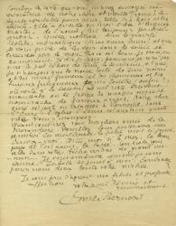 BERNARD ÉmileLettre autographe signée adressée à une bonne amie. Paris, le 2 août 1927 ; 2 pages in-4°. Très belle lettre parlant de ses peintures. « Emile Baumann est venu poser Jeudi, pour son portrait, que j’ai réussi à souhait et selon ses voeux, en trois heures ; par contre j’ai manqué absolument celui de Grolleau, sur lequel j’ai travaillé six heures. Puis je me suis remis à mon grand tableau de “ La lutte de l’homme contre la Femme ou d’Hercule contre les Amazones ” Je l’ai assez bien conduit, je crois, mais cela m’a causé de grandes fatigues, je n’en dormais pas, tant j’avais à réfléchir à son sujet. Finalement il est en voie de conclusion et je lui ai, je crois, arraché l’âme ».