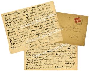 BERNARD ÉmileEnsemble de 2 lettres et un poème, [adressés à M. Eugène Langevin]. Poème autographe, signé de son pseudonyme « Jean Dorsal ». 1922 ; 1 page in-8°. Poème dédié à Eugène Langevin « Lassitude » de 14 lignes. Lettre autographe signée, [adressée à M. Eugène Langevin]. 1/2 page in-4°. Lettre illustrée d'un bois gravé d'Émile Bernard. Lettre de rendez-vous. Lettre autographe signée, [adressée à M. Eugène Langevin]. 1/2 page in-4°. Lettre illustrée de trois bois gravés d'Émile Bernard. « J'ai reçu votre protestation. C'est un magnifique article. J'ai lu aussi avec satisfaction votre belle protestation catholique. Je suis avec vous, vous le savez. Mes amitiés et à bientôt n'est-ce pas le plaisir de vous voir. À demain, jeudi.
