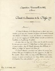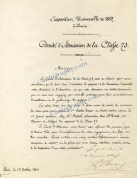 BARRAL Jean-AugustinLettre signée avec 6 mots autographes. Paris, le 25 octobre 1866 ; 1 page in-4°. En-tête « Exposition Universelle de 1867 à Paris — Comité d’Admission de la Classe 73 ». « Le Comité d’Admission de la classe 73, vous a informé par une circulaire qu’il était dans l’intention de proposer à la Commission Impériale votre admission à l’Exposition, et que cette admission ne serait prononcée que si vous vous engagiez par écrit de participer aux frais qu’entraîneront l’installation et le gardiennage des produits. »