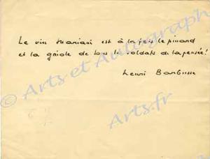 BARBUSSE HenriPensée autographe, signée. 1 page in-8°.« Le vin Mariani est à la fois le pinard et la gnole de tous les soldats de la pensée. »Connue comme « vin Mariani », la préparation est commercialisée à l’époque sous le nom de « vin tonique Mariani (à la Coca du Pérou) ». La boisson est un énorme succès qui lui vaut la célébrité dans toute l’Europe. En France, la version cocaïnisée du vin Mariani sera autorisée jusqu’en 1910.