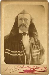 BARBEY D’AUREVILLY Jules AmédéePhotographie signée. Portrait de Barbey d’Aurevilly vers 1880.Épreuve : 13,8 x 10,2 cm. Montage : 16,5 x 10,8 cm.Tirage albuminé monté sur carton du studio Ancienne Maison Melandri, Poirel successeur, à Paris. Signature autographe de Barbey d’Aurevilly à l’encre rouge sous l’épreuve, sur le montage. Au dos mention manuscrite « Pour Madame Olga Lamoureux ».