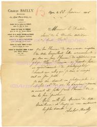 BAILLY CharlesLettre autographe signée, adressée au secrétaire de la direction artistique au Monde Illustré. Lyon, 22 février 1886 ; 1 page in-4°, à son en-tête. « Vous me ferez l’honneur de reproduire mon groupe Alsace-Lorraine. »