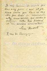 BAKST Léon (Lev Samoïlevitch, Rosenberg, dit)Lettre autographe signée [adressée au comte Robert de Montesquiou]. « Ce mardi » ; 1 page 1/2 in-12. « Madame Rubinstein m’apprend que vous avez bien voulu m’écrire deux lettres sur l’adresse de l’hotel Byron; mais ces deux lettres ne me sont pas parvenues, car je n’ai jamais mis le pied à mon atelier, ayant pris un autre, rue Falguière ! Je suis désolé qu’elles soient égarées et surtout qu’à plusieurs reprises je demandais à Reynaldo Hahn ou vous êtes et ou vous passez l’été. Il me disait que vous êtes à la campagne et que vous reviendriez l’automne. Je suis heureux de savoir que vous avez pensé à moi », etc.