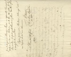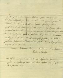 BAILLOT PierreLettre autographe signée adressée à Madame Reiset. 28 février 1830, 1 page 1/2 grand in-4°.adresse au dos avec manque du à l’ouverture du cachet, n’entache pas le texte. Lettre au sujet d’une représentation chez Mme Reiset, et de ses prochains engagements. Il remercie sa correspondante et son mari pour toute la bonté dont il font preuve. « Je m’estimerai donc heureux de faire de la musique chez vous, et serait tout à votre service ; mais le choix du jour me serait impossible à faire en ce moment d’une manière régulière ; je ne puis vous offrir que mardi 9 mars, puisque j’ai contracté des engagements pour les autres mardis et soirées où il y n’y a point opéra : quant à celles-ci je veux vous dire celle que le service ne pourrait l’aimer libre, comme chose trop précaire que l’on ne peux connaître d’avance et dont on ne peut se permettre de disposer. Si mardi 9 peut vous convenir, Madame, je ne doute pas que Monsieur Reiset ne rassemble sans peine quelques uns de nos partenaires »