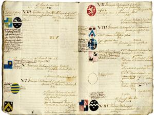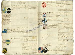 ARMOIRIES — GÉNÉALOGIE FAMILLE DU BOSQUIEL.« Généalogie de la famille du Bosquiel ». Manuscrit de la première moitié du XIXe siècle en un cahier in-4° de 16 feuillets. Environ 110 blasons peints en marge du texte. Quelques blasons se présentant sous la forme de cartons. Cette famille semble avoir son berceau en Artois ou dans le Boulonnais. Beau manuscrit.