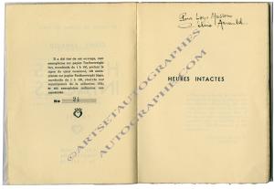 ARNAULD Céline« HEURES INTACTES, POÈMES ». Éditions Les Cahiers du Journal des poètes, Paris, 1936 ; édition originale, 1/100 exemplaires numérotés sur papier Featherweight fort portant le signe du cœur couronné (n°24). Envoi autographe signé : « Pour Loys Masson, Céline Arnauld ». Très bel état. Loys MASSON [Rose-Hill, Île Maurice, 1915 - Paris, 1969], poète et romancier mauricien.