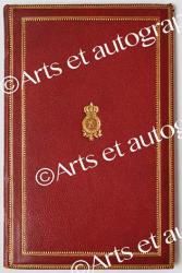 Armoiries royales - [BELGIQUE].« Des préjugés en astronomie » par F. Folie. Bruxelles, F. Hayez, 1892 ; in-8°, chagrin rouge, double encadrement de filets et fines roulettes dentelées dorées ornant les plats, petites armoiries royales au centre du premier, dos lisse, tranches dorées (G. Rykers, relieur). Infime accroc à la coiffe supérieure. Une planche. Discours prononcé dans la séance publique de la Classe des sciences de l’Académie royale de Belgique, le 16 décembre 1892. Exemplaire aux armes du roi des Belges.