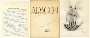 ARAGON Louis« ARAGON » illustré par Michel Michaux. 1963 ; 13 illustrations. Livre d’artiste ou maquette originale pour un ouvrage titré « Aragon », textes et illustrations de Michel Michaux, entièrement réalisé à la main. Textes écrits à la plume, rehaussés de lettrines à l’or, d’illustrations à pleines pages représentant des plantes ou des bouquets.L’ouvrage est truffé d’une lettre autographe signée d’Aragon, adressée au peintre Michel Michaux. Sans date ; 1 page 1/4 in-4°. Relative au présent ouvrage qu’Aragon avait reçu puis retourné au peintre, il comment le présent ouvrage :« D’abord merci de vous être intéressé à mes poèmes, et de les avoir pris pour prétexte, et de m’avoir envoyé votre travail. Il est toujours intéressant pour moi de voir dans l’esprit ou les yeux d’un autre ce reflet de ce que j’ai pensé. C’est ainsi que j’ai goût, et respect, des chansons qu’on fait de mes vers, même si cela n’est pas absolument ressemblant à ce que j’ai écrit. Une certaine atmosphère que vous avez cernée, que vous avez donnée à mes vers, vaut pour moi beaucoup plus que les critiques que l’on peut m’en faire. Ceci dit, il faut m’excuser de ne pas vous avoir retourné le recueil tout de suite. J’ai été malade, et surmené par le travail laissé en retard ; il fallait faire le paquet, imaginez-vous, cela ne va pas de soi pour moi... Et puis j’avais pensé montrer cela à quelqu’un qui aurait pu s’y intéresser, et qui était moins intelligent que je ne l’imaginais... Je vous renvoie donc tout ceci avec un grand retard, et mes regrets. Mais très sympathiquement. Aragon. »