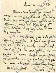 ZOLA ÉmileLettre autographe signée, adressée à Fernand Xau, journaliste et fondateur du quotidien Le Journal. Paris, 11 novembre 1893 ; 1 page in-12.« Je vous envoie ce que j’ai trouvé. Je crains bien que cela ne fasse guère votre affaire, car c’est bien long et peu drôle. Enfin, vous l’aurez voulu. Si vous désirez que cela passe lundi matin, il faut que j’aie ce soir samedi les épreuves avant neuf heures. Je les corrigerai, de façon à vous les renvoyer pour dimanche soir. Qu’on respecte mes alinéas, même trop longs. »Zola évoque sans doute « Le drame lyrique » publié le 24 novembre 1893 dans Le Journal.