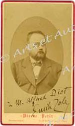 ZOLA ÉmilePhotographie dédicacée à Alfred Riot. Photographie Pierre Petit. Sans date ; 10,5 x 6 cm. Portrait le représentant de face dans un ovale, dédicacé : « À M. Alfred Riot, Émile Zola. »