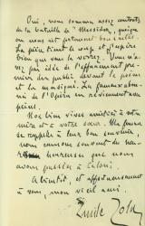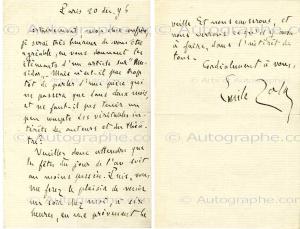 ZOLA ÉmileLettre autographe signée, adressée à un journaliste. Paris, 20 décembre 1896 ; 1 page 1/2 in-8°. Zola évoque ici son poème lyrique en prose Messidor (4 actes) qui fut mis en musique par le compositeur Alfred Bruneau. « Je serai très heureux de vous être agréable, en vous donnant les éléments d’un article sur Messidor. Mais n’est-il pas trop tôt de parler d’une pièce qui ne passera que dans deux mois, et ne faut-il pas tenir un peu compte des véritables intérêts des auteurs et du théâtre ? Veuillez donc attendre que les fêtes du jour de l’an soit [sic] au moins passées. »Messidor fut joué pour la première fois à l’Opéra de Paris le 19 février 1897 comme le confirme Zola dans sa lettre. Malgré un accueil enthousiaste du public, les représentations cessèrent en avril 1897 après avoir été jouées 13 fois, compte tenu des positions de Zola pour Dreyfus qui furent peu appréciées par les directeurs de l’Opéra et ses abonnés.