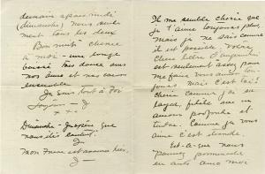 PERSHING John JosephLettre autographe signée « J. », adressée à Micheline Resco. 15 pages formats divers, quelques enveloppes ; en français.Extraordinaire lettre damour accompagnée des clefs pour des communications chiffrées, adressées à sa maîtresse, la peintre portraitiste Micheline Resco [1894-1968]. 73 rue de Varenne samedi soir. « Ma chère adorée jai été chez vous et nous avons sonné près de demi heure sans réponse [ ], jétait très fâché de manquer une instant avec vous mon Darling. Il me semble chérie que je taime toujours plus, mais je ne sais comme il est possible. Votre chère lettre daujourdhui est seulement assez pour me faire vous aimer toujours [ ] avec un amour profonde et tendre. Comme je vous aime cest éternelle. Je suis tout à toi toujours. J. » Il linvite à une promenade à deux en auto, le lendemain. « Bon nuit chérie à moi une longe baissé très douce avec nos âmes et nos curs ensemble » Les clefs du code de correspondance, sur 6 paperolles, sont des listes de mots, parfois accouplés avec un autre terme en français ou anglais, leur signification en regard. « Nicole Je nai pas compris le câble. Watching Je suis à Wash. Violet Je suis en tour dinspection ou en voyage. [ ] Columbus/Columbine Jai confiance, vs êtes toute ma vie. Azure/usure Ayez confiance et courage » « Éclair Je désire partir le pl. vite possible. Corail Quand dois-je partir ? [ ] Étoile/Estelle Vous êtes tout à fait à moi, mon ange mon tout » On joint le certificat de bénédiction du « mariage de conscience » contracté entre Pershing et Micheline Resco, célébré à lhôpital Walter Reed par Jules A. Baisnée, prêtre de Saint-Sulpice, Washington 3 septembre 1946.Dossier extraordinaire !