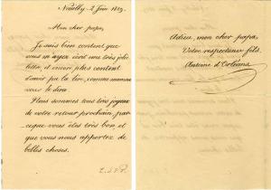 ORLÉANS Antoine d’Lettre autographe signée « Antoine d’Orléans », adressée à son père, Louis-Philippe. Neuilly 2 juin 1829 ; 1 page et demie in-8°. Charmante et rare lettre d’enfant (il a cinq ans). « Mon cher papa, Je suis bien content que vous m’ayez écrit une très jolie lettre, et encore plus content d’avoir pu la lire, comme maman vous le dira. Nous sommes tous très joyeux de votre retour prochain, parce que vous êtes très bon, et que vous nous apportez de belles choses. » Rare lettre d’enfant.