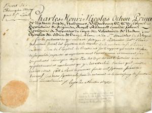 OTHON DE NASSAU-SIEGEN Charles Henri NicolasPièce signée « le pr. de Nassau Siegen ». Paris, 1er février 1779 ; in-folio oblong (24 x 32 cm), sur vélin.Brevet de chirurgien major pour le sieur Pierre Laval, élève de l’hopital de Bicêtre.