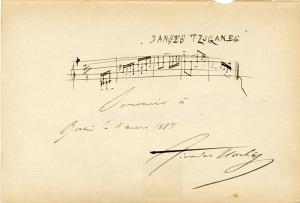 NACHÉZ Tivadar (Theodor Naschitz)Portée musicale autographe signée, dédicacée à Olga Ruben. Berlin, 11 mars 1884 ; 1 page in-12 oblongue.Extrait de Danses Tziganes.