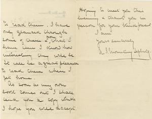MOUTENEY JEPHSON Arthur JermyLettre autographe signée, adressée à Jules Leclercq à Bruxelles. Bruxelles, 24 avril 1890 ; 2 pages 1/2 in-12, en anglais. En-tête du « Grand Hôtel Britannique ». Il le remercie pour les livres et revues reçus et promet de les lire dès quil sera rentré chez lui. Peu commun.