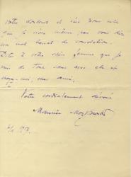 MOSZKOWSKI MoritzLettre autographe signée. 6 novembre 1917 ; 2 pages in-8° à l’encre violette. Lettre de condoléance à un ami ayant perdue sa fille. « Je n’ai pu vous approchez ce matin à la fin du service religieux. Je viens donc vous dire par lettre toute la part très vive et profondément sicère que je prend au malheur indicible qui vous a frappé en la personne de votre fille. La destinée de ma propre vie m’a rendu susceptible de mesurer votre douleur et c’est pour cela que je n’ose même pas vous dire un mot banal de consolation. Dites à votre chère femme que je suis de tout coeur avec elle. »