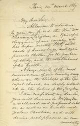 MORSE Samuel Finley BreeseLettre autographe signée adressée George P. Marsh alors dans son poste de minisitre plénipotentiaire et envoyé extraordianaire des Etats-Unis en Italie. Paris, 14 mars 1967 ; 2 pages in-8°. Geroge Marsh a soutenu Morse pour faire reconnaitre et adopter le télégraphe électrique principalement en Europe. Il a défendu Morse et son brevet d’invention contre des tentatives de contrefaçon et rivalité en Europe. Cette lettre va permettre de présenter le révérend Langdon, qui qui va introduire le l’eglise Epicopal protestante en Europe. « Allow me to introduce to you my friend the Rev. Wm Chauney Langdon , an Episcopal clergyman of our country, who has before visited Italy on errands of benevolence and again proceeds thither for the purpose of study and the establishment of his health. A large circle of the most eminent men of our country among whom are the Bishops of the Episcopal Church, are deeply interested in the labors of Mr. Langdon. I am confident, my dear Sir, you will discover in Mr. Langdon a well read and profound scholar, as well as, an humble and jealous Christian, and will derive real pleasure in communicating with him. » Samuel Morse présente à Georges Marsh son ami, le Révérend William Chauncey Langdon, un pasteur épiscopal américain. Il y explique que Langdon s’est déjà rendu en Italie par le passé pour des actions de bienfaisance, et qu’il y retourne cette fois pour étudier et rétablir sa santé. Morse souligne que de nombreuses figures importantes aux Etats-Unis, notamment des évêques de l’Eglise épiscopale, soutiennent les travaux de Langdon. Il affirme que Marsh trouvera en lui un homme très instruit, profondément croyant et zélé, et qu’il prendre plaisir à échanger avec lui. Le Révérend William Chauncey Langdon est un missionnaire épiscopal américain très actif en Europe et notamment en Italie. Il travail en étroite collaboration avec des diplomates Américains partout en Europe pour promouvoir le protestantisme.