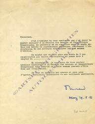 MORAND PaulPièce signée. Vevey, 29 août 1956 ; 1 page in-4°. « J’ai l’honneur de vous confirmer que j’ai donné le mandat exclusif à la Société des Auteurs et Compositeurs dramatiques de percevoir et de contrôler dans le monde entier mes droits de reproduction graphique, concernant l’exploitation de mes ouvrages dramatiques par une maison d’édition. » Il demande à son correspondant d’adresser à « la Société des Auteurs et Compositeurs dramatiques tous comptes et toutes sommes pouvant m’être dues par votre maison ».