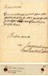 MONTPENSIER Anne-Marie-Louise dOrléans, duchesse de (dite La Grande Mademoiselle)Lettre autographe signée, adressée à M. Jassaud. St Fargeau, 26 avril 1657 ; 2 pages in-4°, adresse avec fermeture de fils de soies vertes sous cachets de cire rouge. Translation ancienne jointe. Superbe lettre où elle le prie de prendre ses intérêts et ceux de Monsieur (Gaston d'Orléans, le frère du roi). « Ils sont si justes et si raisonnables que je ne doute pas de la bonne justice que l'on me rendra. »