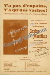MONTÉHUS (Gaston Mardochée Brunschwig, dit)Pièce signée par Louis Marchand. 1939 ; 4 pages in-4°. Pièce illustrée de sa photographiecontenant sur un feuillet de 4 pages, sa photographie, la chanson « Y’a pas d’copains, Y’a qu’des vaches ! ». Dédicace sur la première page, sous la dédicace imprimée à « mon bon camarade, le chansonnier Montéhus, à l’occasion de son 68e anniversaire 9 juillet 1939 », il écrit et signe : « Et aussi à l’ami Coulaud, Marchand ».
