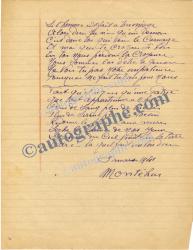 MONTÉHUS (Gaston Mardochée Brunschwig, dit)Manuscrit autographe signé « Supplique à Dieu ». [Circa 1941] ; 2 pages in-4°, à l’encre violette. Manuscrit d’un poème pour une publication qui devait s’appeler « Cris de misère ». « Tous les peuples font des prièresAppelant la douce bontéPour barrer la route à la guerreEt sauver notre humanité.Pour toi on allume des cierges,Des mères gémissent à genoux,Les enfants invoquent la ViergePourquoi ne fais-tu rien pour nous.[…]Si l’homme est fait à ton image,Alors Dieu tu n’es qu’un démonC’est donc toi qui veux le carnage.Et moi qui te croyais si bon,En toi nous perdons la croyance,Nous sommes las d’être à genoux.Ne vois-tu pas notre impatiencePourquoi ne fais-tu rien pour nous ».