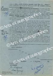MONTHERLANT Henry Millon deContrat imprimé signé. Bruxelles, 7 février 1952 ; 2 pages in-4°. « Je soussigné Oscar Lejeune Directeur du Théâtre du Parc à Bruxelles m’engage vis-à-vis de Monsieur de Montherlant auteur de la pièce en 3 actes intitulée « Celles qu’on prend dans ses bras » à faire représenter ladite pièce sur mon Théâtre du Parc de Bruxelles et en Belgique entre le 1er octobre 1952 et le 31 mai 1953 et à me conformer aux conditions particulières ci-après stipulées : Je verserai pour chacune des représentations de ladite pièce, un droit en argent de 10 %. »