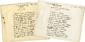 MONTHOLON BERTRAND MARCHAND.Rare lettre (rédigée par Bertrand), signée des trois exécuteurs testamentaires, adressée au comte de Lavalette. Paris 2 mai 1823 ; 1 page in-4°. Sur le legs de Napoléon. « Nous avons l'honneur de vous adresser un mandat de la somme de 400 francs. Vous recevrez ainsi pour 1822 les intérêts de cinquante pour cent de votre legs, à raison de quatre pour cent. Vos très humbles serviteurs, Montholon, Bertrand, Marchand. »