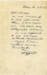 WEYGAND MaximeLettre autographe signée, adressée à Max Aghion. [Plou Jean], 18 août 1930 ; 1 page in-8°, sur papier bleu avec en relief « Coatamour, Plou Jean, Morlaix, Finistère ». « Je suis très confus de ne vous avoir encore remercié de votre Louis-Philippe. Il ma fallu attendre dêtre au vert pour trouver un peu de temps pour ma correspondance. Je nai pas encore lu le livre, mais je men promets beaucoup de joies. »